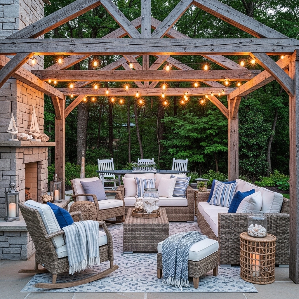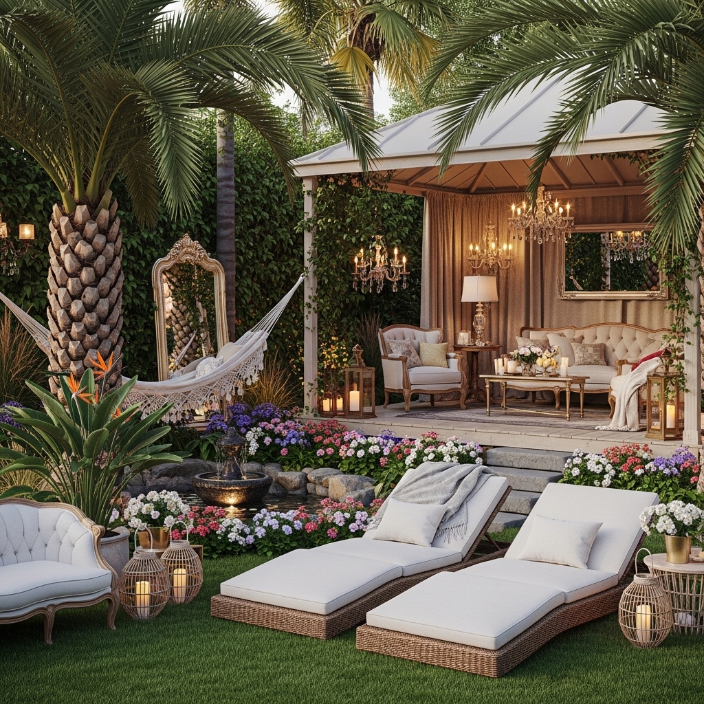 Bring the beach to your backyard with light, breezy fabrics in whites, blues, and sandy neutrals. Wicker or rattan furniture adds warmth and texture, while seashell accents and nautical touches complete the look . This style pairs beautifully with lush tropical landscaping and string lights for evening ambiance.