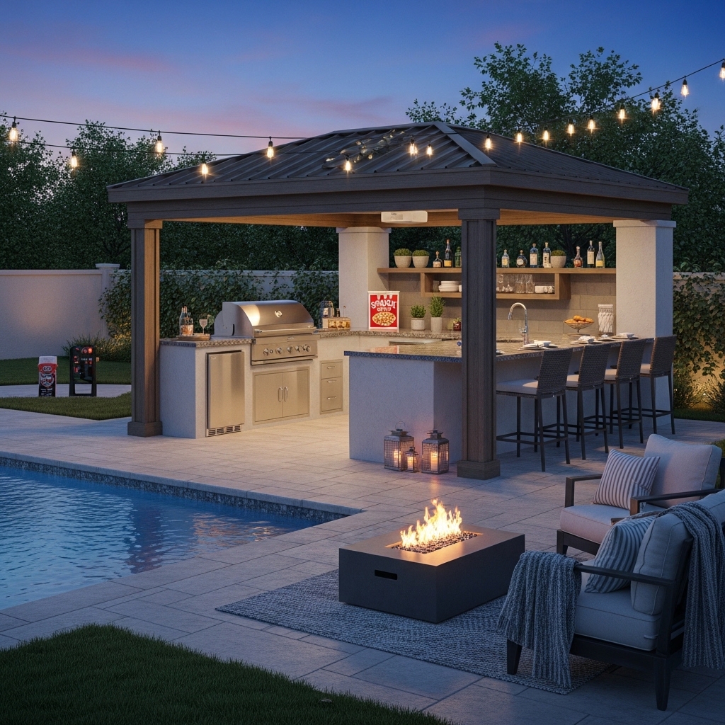 Take entertaining to the next level with a cabana that houses a grill, counter space, sink, and built-in refrigerator. Some homeowners add pizza ovens, griddle tops, or Argentinean grills for variety . A spacious island creates a natural gathering spot, while comfortable seating nearby ensures guests stay part of the action .