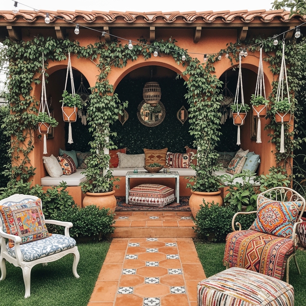 Layer textiles, mix patterns, and embrace eclecticism. Colorful throw pillows, hanging plants in macramé holders, and warm string lights create a vibrant, relaxed atmosphere. Thrifted vintage furniture adds character, while the overall vibe remains effortlessly casual .