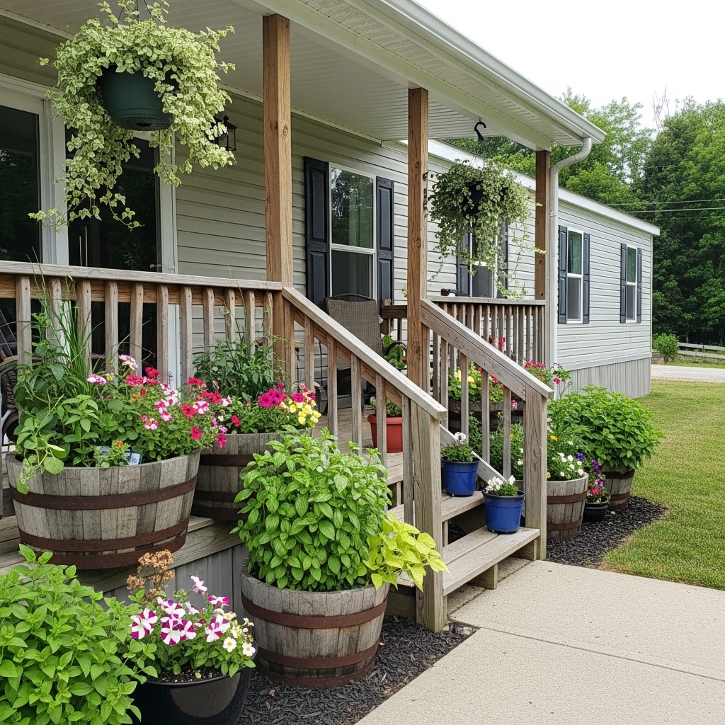 - Cozy Factor: Plants soften the hard lines of a mobile home. Placing a few large planters at the base of your steps or lining a walkway with them creates a lush, welcoming entrance .