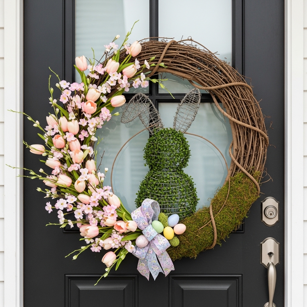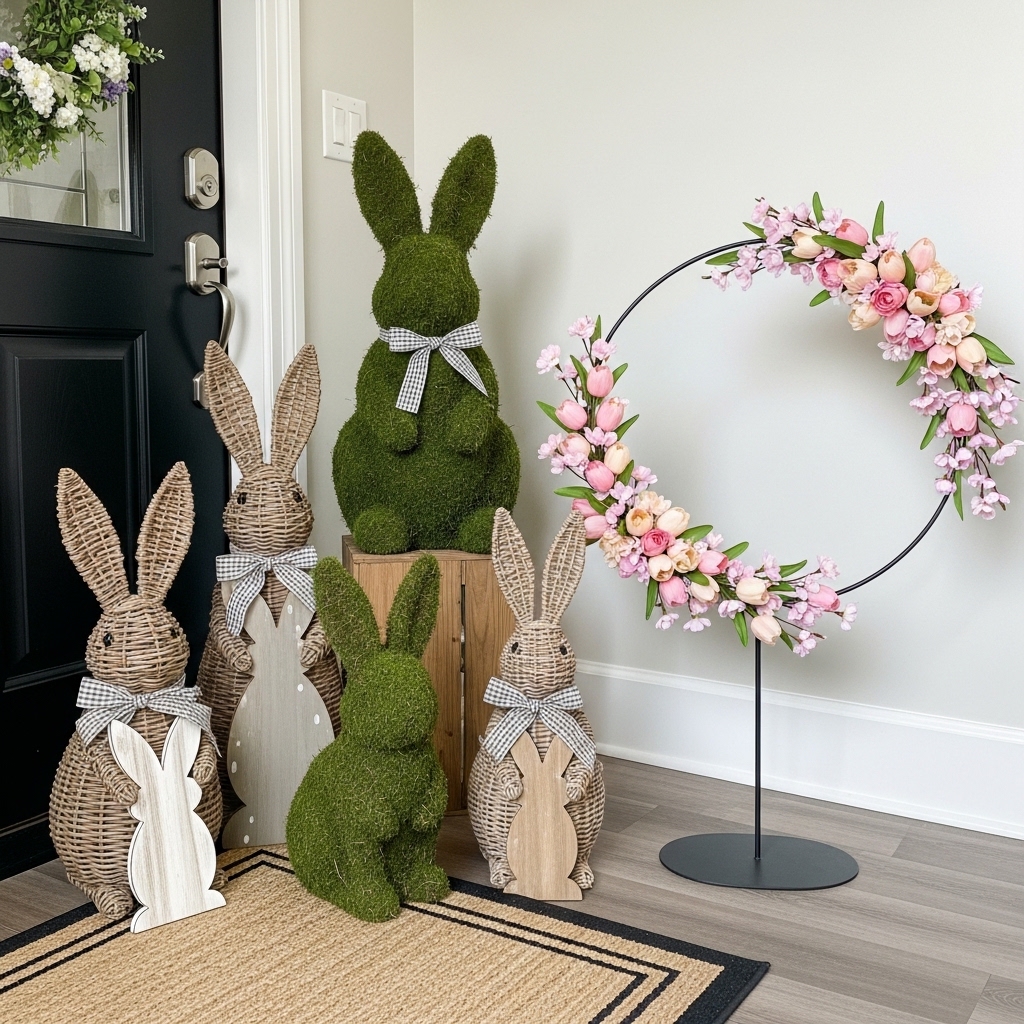 - Rustic Charm: Wicker bunnies or hand-painted wooden cutouts in muted farmhouse tones add a handmade, cozy feel to the entryway .