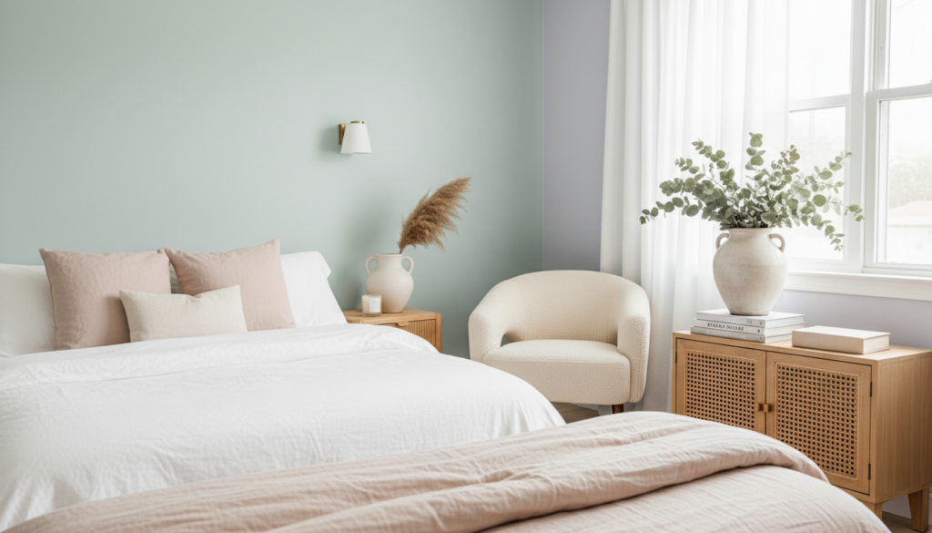 - The 70/20/10 Rule: Use 70% a neutral base (cream, white, light beige), 20% a soft pastel (like sage green), and 10% a contrasting texture (wood, rattan, or black metal).