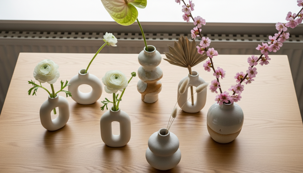 - Texture Mix: Glossy ceramic combined with matte organic shapes. Hand-thrown pottery with visible imperfections.
