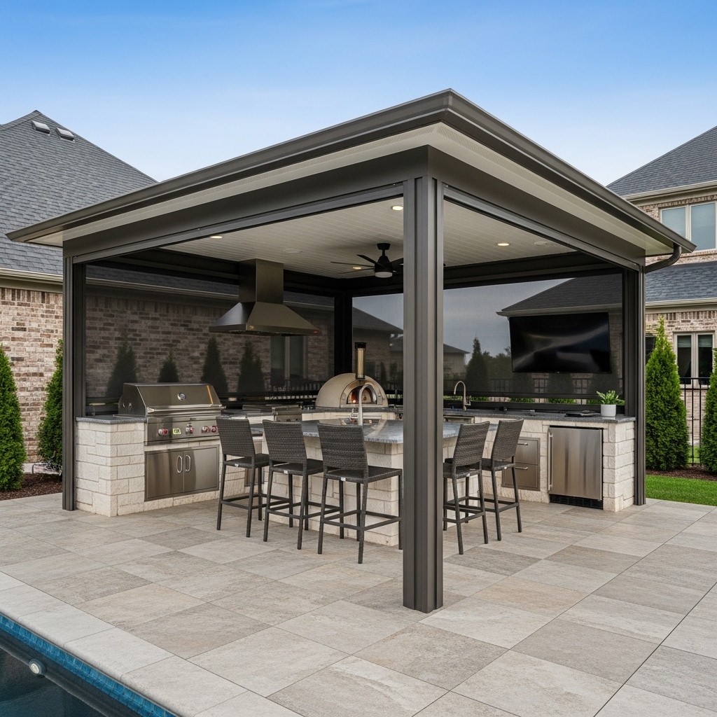 - Outdoor Kitchens: The poolside kitchen is now a must-have, featuring professional-grade grills, pizza ovens, built-in refrigeration, and spacious islands for bar-style seating .