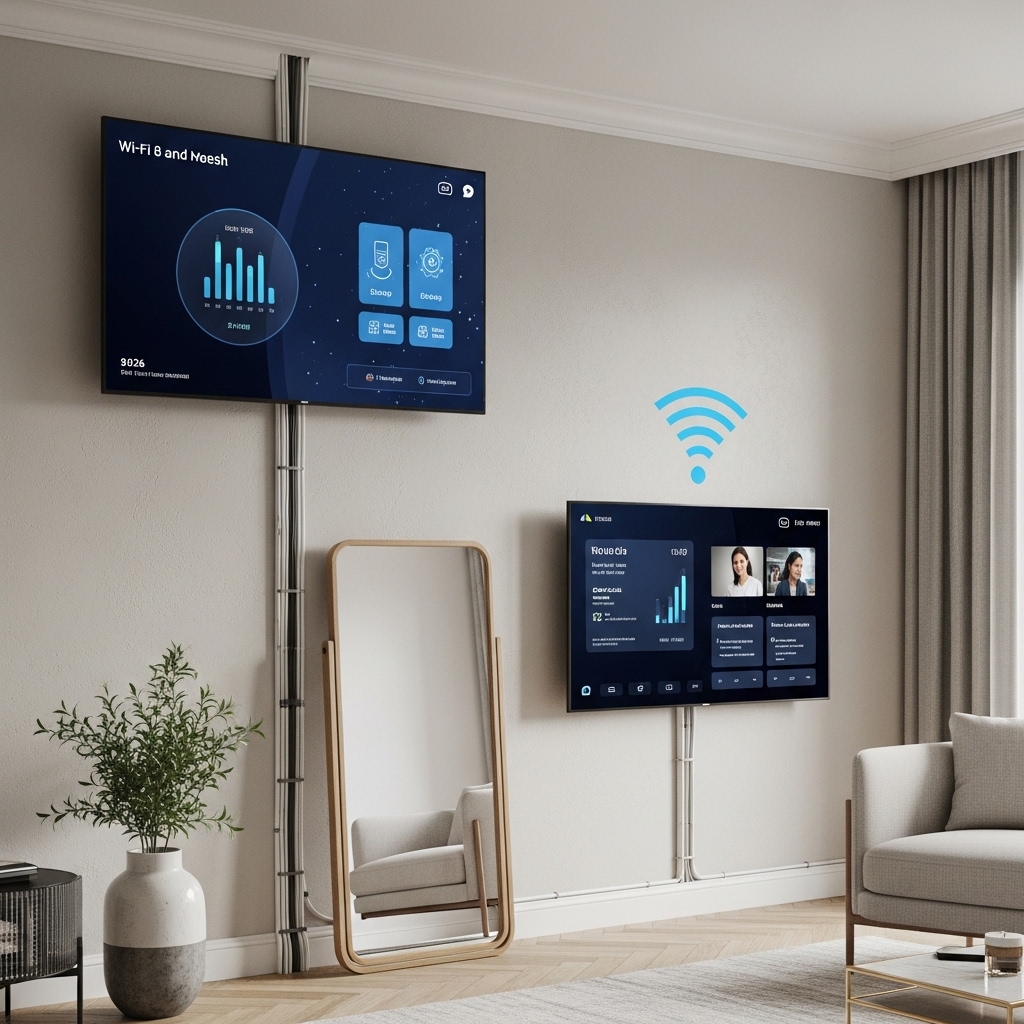 - The Trend: Wi-Fi 8 and mesh systems are now embedded into the structural insulation of homes, eliminating the need for unsightly routers. Wiring is completely concealed behind “smart drywall.” When screens are necessary, they are disguised—mirrors that display health data only when you wave your hand, or picture frames that turn into virtual meeting screens at the strike of 9:00 AM.